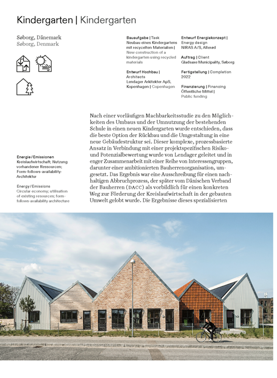 Ein Supermarkt in wiederverwertbarer Holz-Beton-Konstruktion mit Dachfarm; ein Kindergarten erbaut mit Recyclingmaterial von vor Ort; die Sanierung eines Bürogebäudes, das ohne Klimaanlage und Lüftungssysteme auskommt – die Möglichkeiten zur Reduktion von Emissionen und Energiebedarf bestehen neben Materialwahl und innovativen Betriebskonzepten, vor allem auch darin, den gesamten Lebenszyklus eines Gebäudes mitzudenken; hierzu gehört auch, im Zweifelsfall eher zu sanieren als neu zu bauen. Der Band vereint anschaulich konkrete Beispiele und gibt Ansatzpunkte für das Bauen von heute und morgen.