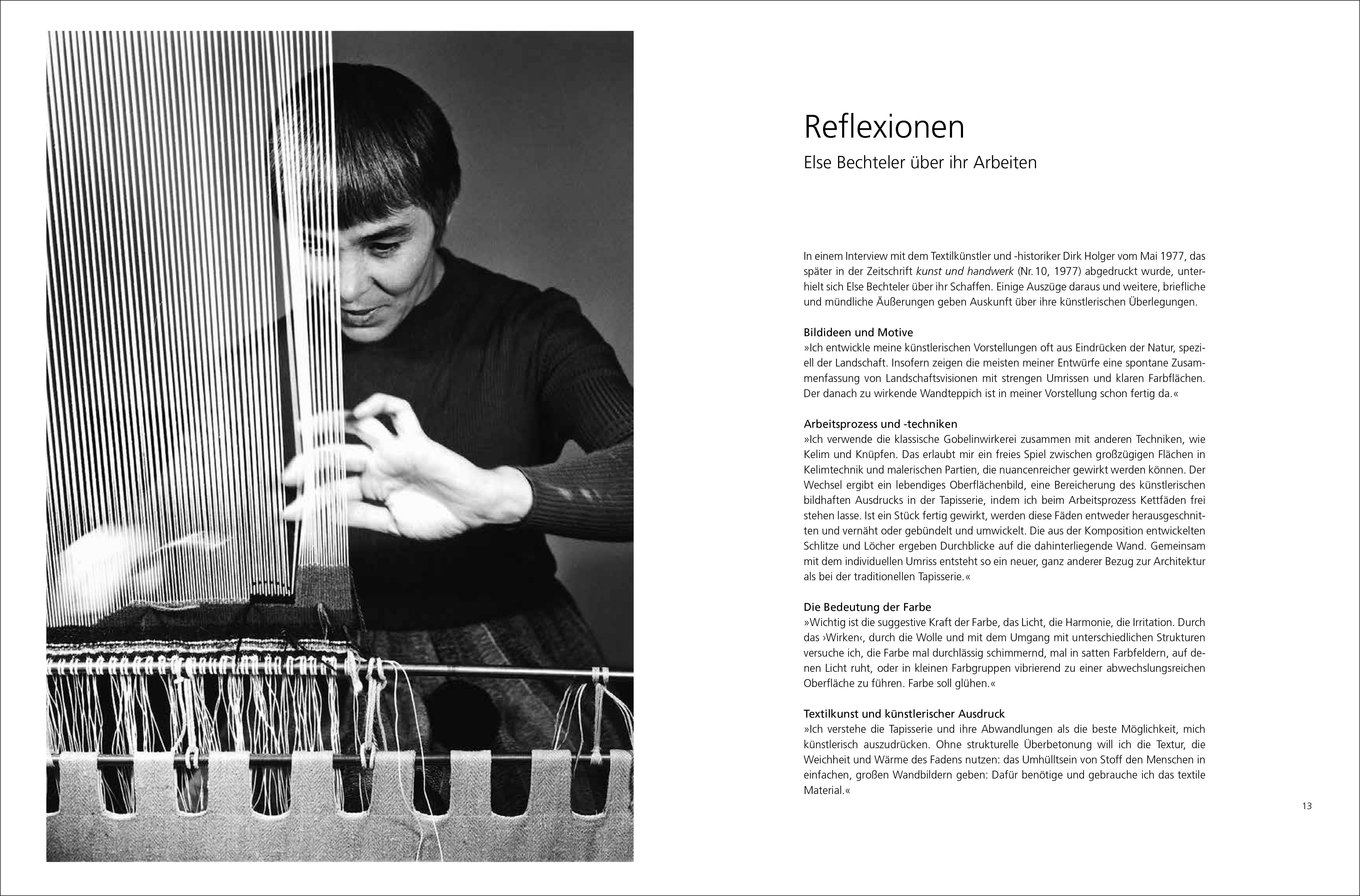 Die Textilkünstlerin Else Bechteler-Moses (*1933) hat in mehr als fünfzig Jahren ein Werk geschaffen, das die traditionelle Bildweberei um Konzepte der (post-)modernen Malerei bereichert und ästhetische Tendenzen nach 1945 für die Tapisserie selbst fruchtbar macht: Faden und Farbe treten in ein Wechselverhältnis, bei dem das textile Material stets seinen Eigencharakter bewahrt.
