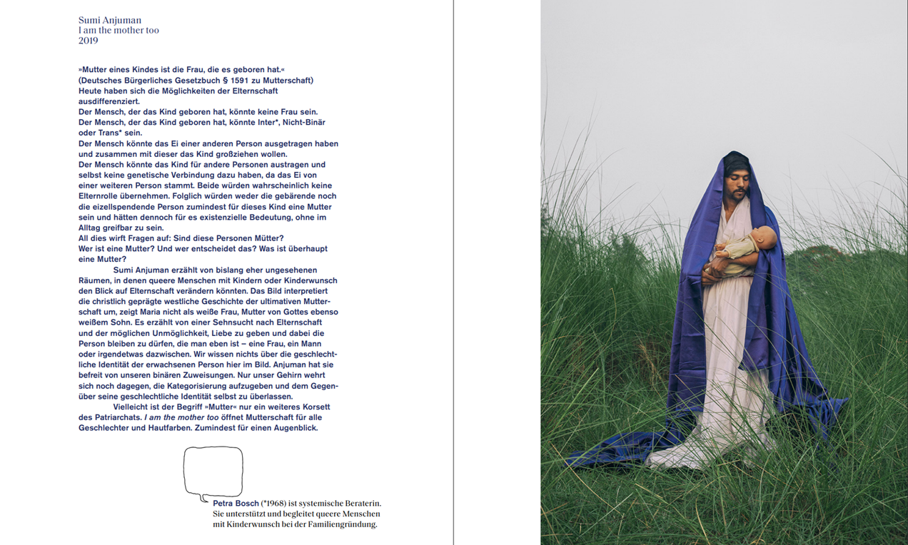 Mit Kunstwerken u.a. von Max Ernst, Paula Modersohn-Becker, Aldo Gianotti, Marta Worringer, Oliviero Toscani, Hannah Höch, Vivian Greven, Caroline Walker, Egon Schiele, Käthe Kollwitz und Werkbeschreibungen von Mareice Kaiser (Journalistin / Autorin), Neram Nimindé-Dundadengar (Hebamme), Mandy Mangler (Gynäkologin), Nils Pickert (Blogger/Autor), Barbara Vinken (Wissenschaftlerin)